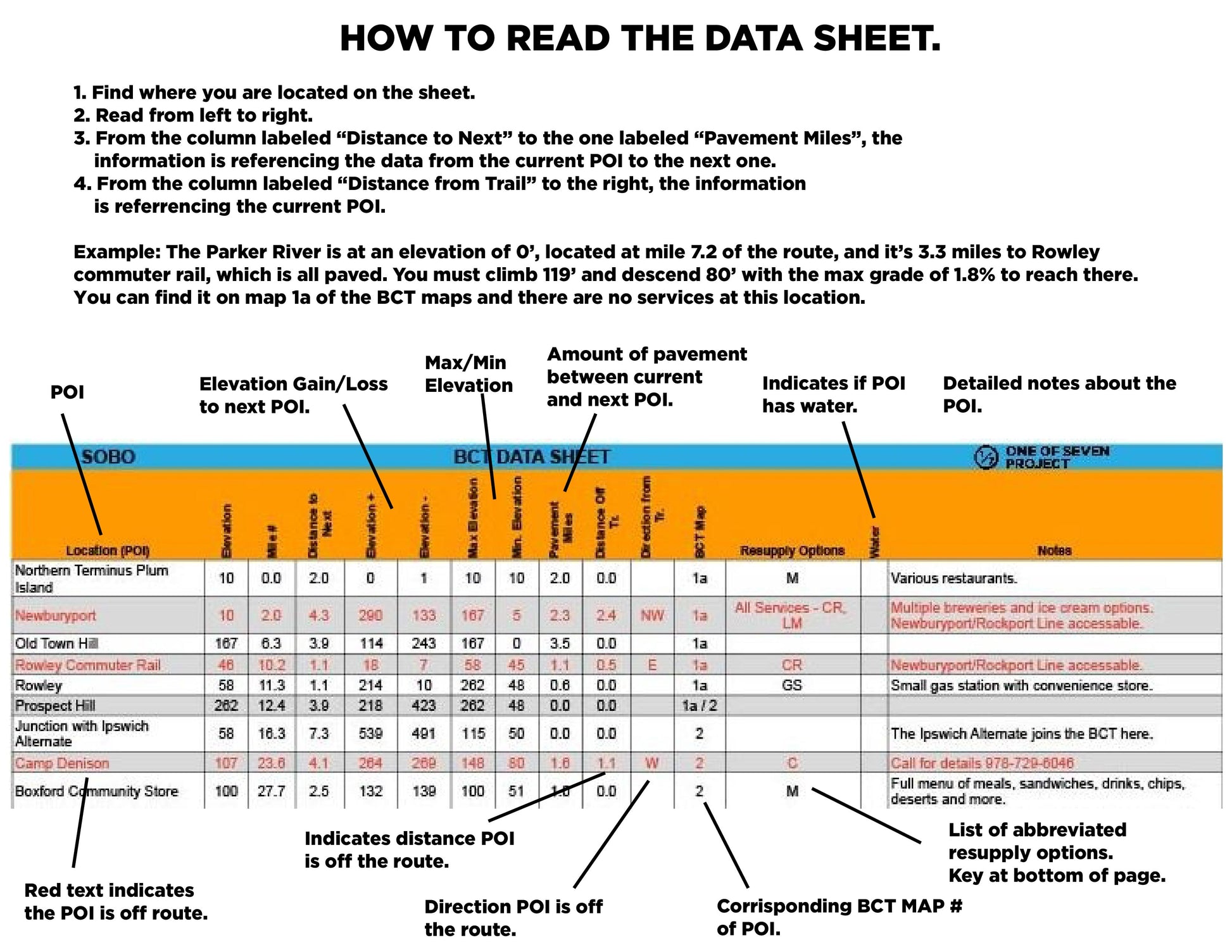 Essential POIs with mileage, elevation profiles, and distances to the next stops.